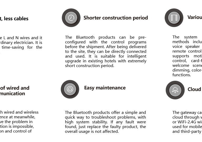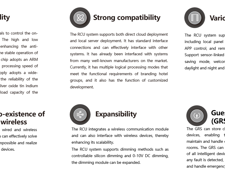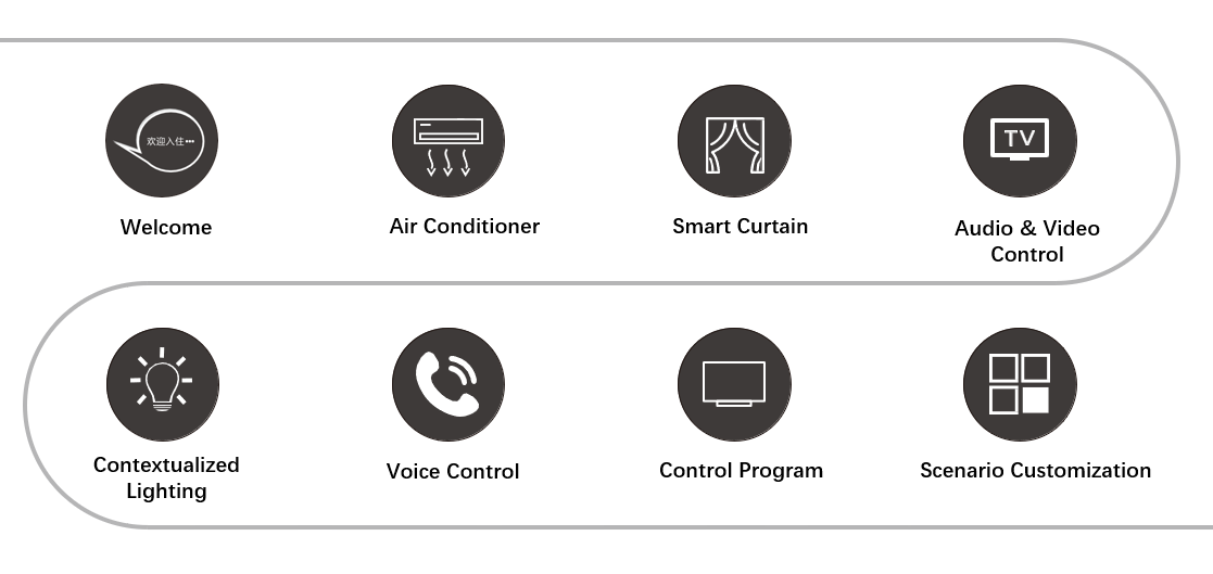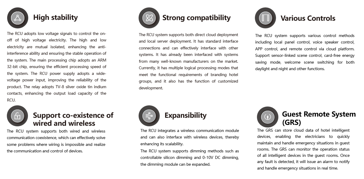 Adopting the RCU as the control center, the exterior devices are connected to the RCU through Cat6 network cables to form a network of dry contact points and bus protocol for communication. By processing low voltage signals in the network, the RCU accomplishes the purpose of controlling high voltage signals. The RCU is equipped with an Ethernet interface, it can be directly connected to the cloud and meanwhile supports local server deployment. It supports configuration through the Web interface of remote computers via the network, thereby enabling control of lights, curtains, air conditioners, room switch panels etc., and combined with sensors, it can achieve control of linked scenes. It can be easily integrated with other systems, such as PMS systems, smart voice speaker systems, TV systems etc.